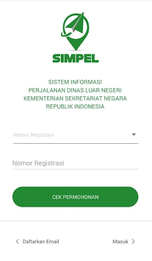 Aplikasi SIMPEL adalah sebuah sistem informasi perjalanan dinas luar negeri dari Kementerian Sekretariat Negara, aplikasi ini dirancang untuk memudahkan monitoring status permohonan dan menyampaikan laporan perjalanan dinas luar negeri dimanapun berada. Selain dapat memonitor status permohonan dan penyampaian laporan perjalanan, terdapat juga fitur untuk unduh surat persetujuan. Untuk pengecekan status permohonan tidak perlu melakukan login, siapapun dapat melakukan pengecekan status permohonannya dengan data yang dimilikinya.