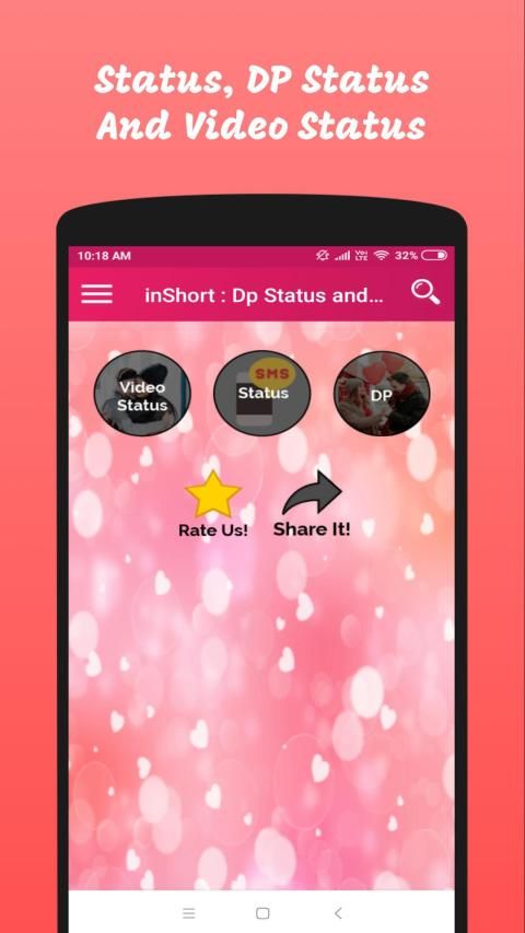 Gunakan inShorts: Dp Status dan aplikasi Video untuk mengirim status yang indah dengan tanda kutip yang ingin, hebat atau mengungkapkan perasaan Anda. inShorts: Dp Status dan Video menyediakan dp, status, dan status video untuk Whatsapp. Anda dapat memilih yang Anda inginkan dari inShorts: Dp Status dan aplikasi Video.