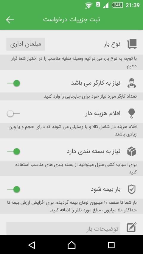 • اضافه شدن انتخاب نوع بار(با مشخص کردن نوع بار، ارايه سرویس به شما بهتر و وسیله نقلیه مورد نظر برای شما ارسال میگردد )