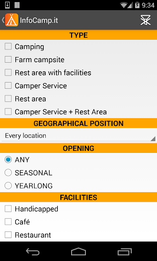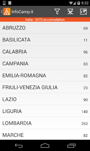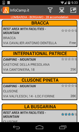 Info Camp APP is free and does not require an Internet connection. It is also possible to purchase the "OFFLINE" option which allows you to look up at the accommodation listing for a year without an internet connection, and thus avoiding any undesired advertising (the internet connection is however required to visualize photographs, accommodations rating and Google maps.)