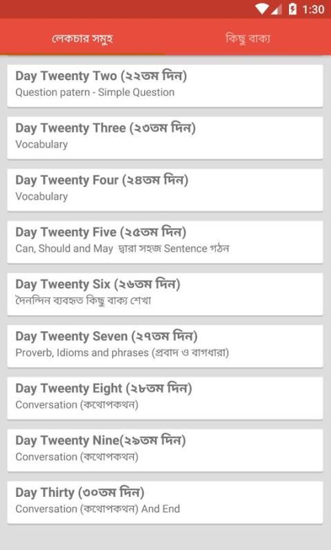 এই অ্যাপটি আমরা এমন ভাবে সাজিয়েছি যাতে আপনি 30 দিনে ইংরেজি ভাষা ভাল ভাবে শেখা যায়. তবে প্রতিদিন অনুশীলনের বিকল্প নাই. এই অ্যাপ এ কি কি আছে তা নিম্নরূপঃ