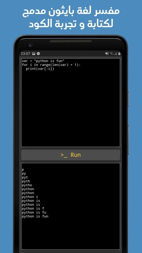 > مفسر لغة بايثون مدمج في التطبيق لتجربة كود بايثون و التعلم عبر التجربة
