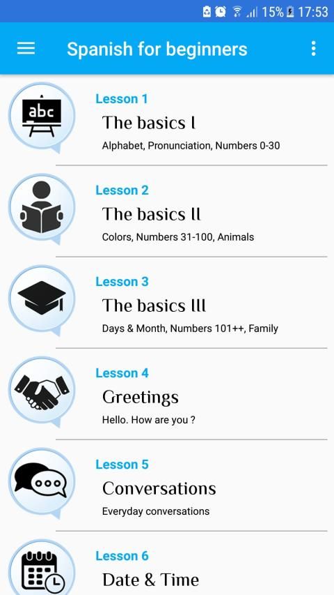 Aplikasi ini dirancang untuk pemula yang ingin belajar bahasa Spanyol dari awal. ini menawarkan dasar tata bahasa yang jelas dan lengkap untuk memperoleh pengetahuan dasar bahasa Spanyol.