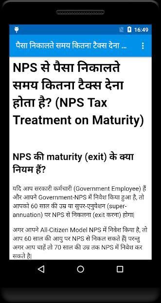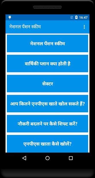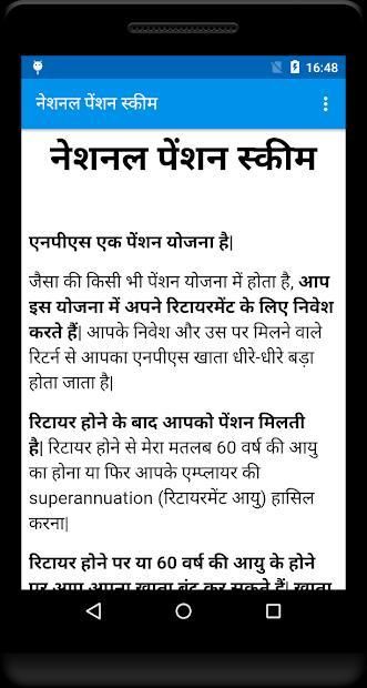 Aplikasi Skema Pensiun Nasional (NPS) ini memberikan semua informasi tentang Skema Pensiun Nasional (NPS) seperti Cara mendaftar, semua kriteria, siapa yang memenuhi syarat, Penerima Manfaat Di Bawah NPS, dll. Dalam bahasa Hindi.