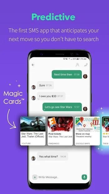 The first SMS & MMS app powered by an AI assistant that predicts what you want so you don’t have to search, making your life easier and saving you time in a non-intrusive way: display the Magic Cards with a short press on any message with ⭐️⭐️⭐️