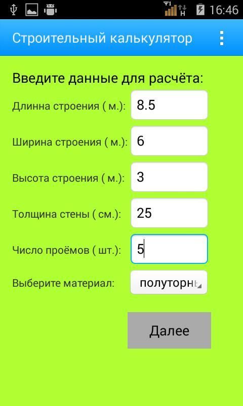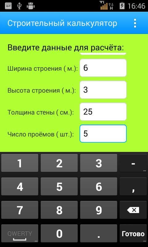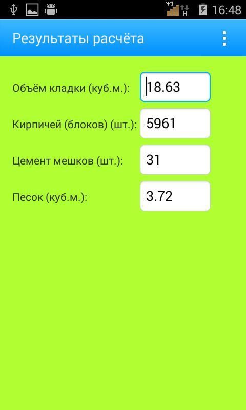 Данное приложение производит расчёт строительных материалов для каменной кладки дома, дачи, бани, гаража и любых других сооружений, которые в плане представляют собой четырёхугольник с одинаковыми противоположными сторонами ( квадрат, прямоугольник, параллелограмм или ромб ). Это доступно на главной странице приложения.