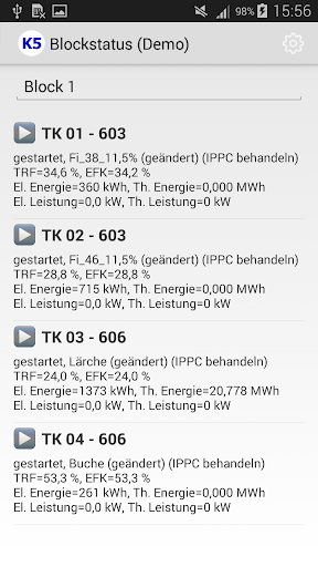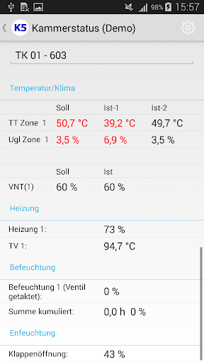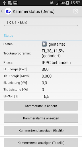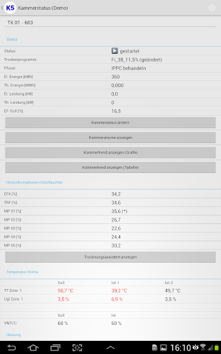• Menampilkan status ruang (lihat semua nama program, fase, TRF, EFK, EF-Soll, Therm dan Electr. Energi, kelembaban kayu, suhu, kecepatan VNT, posisi katup pemanas, humidifikasi, dehumidifikasi, ...) ...