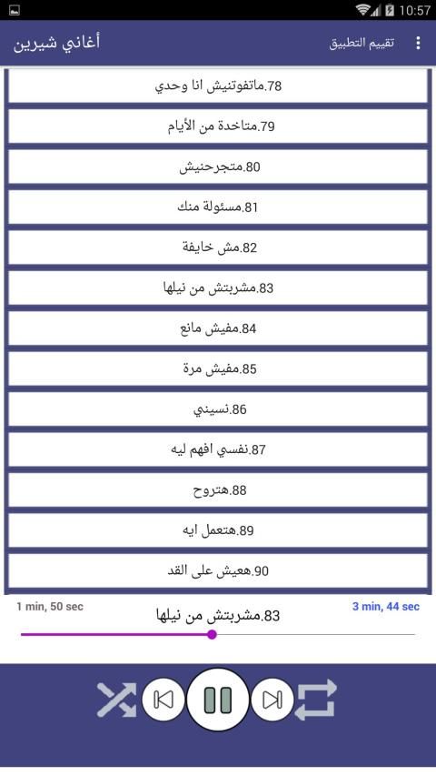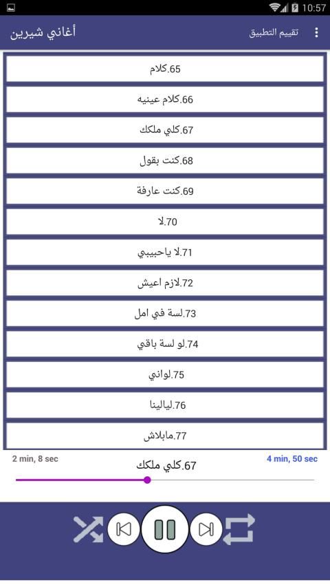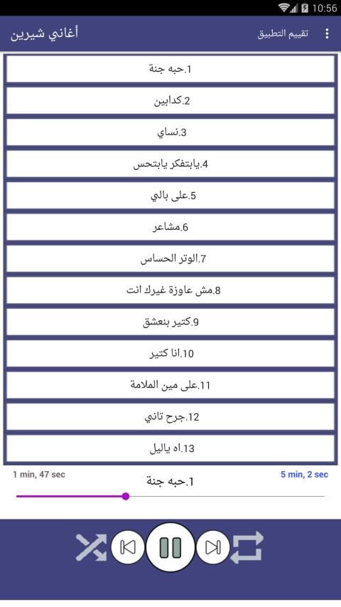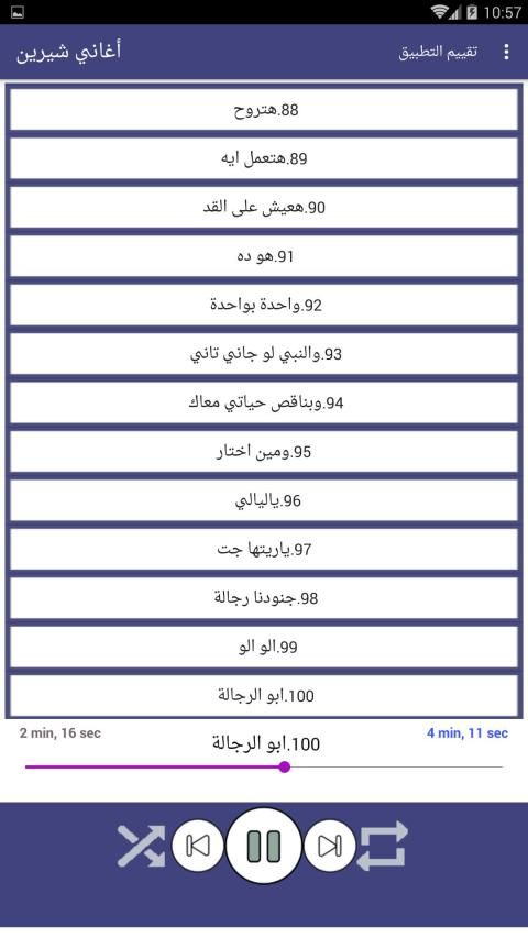 يحتوي التطبيق على الاغاني التالية: