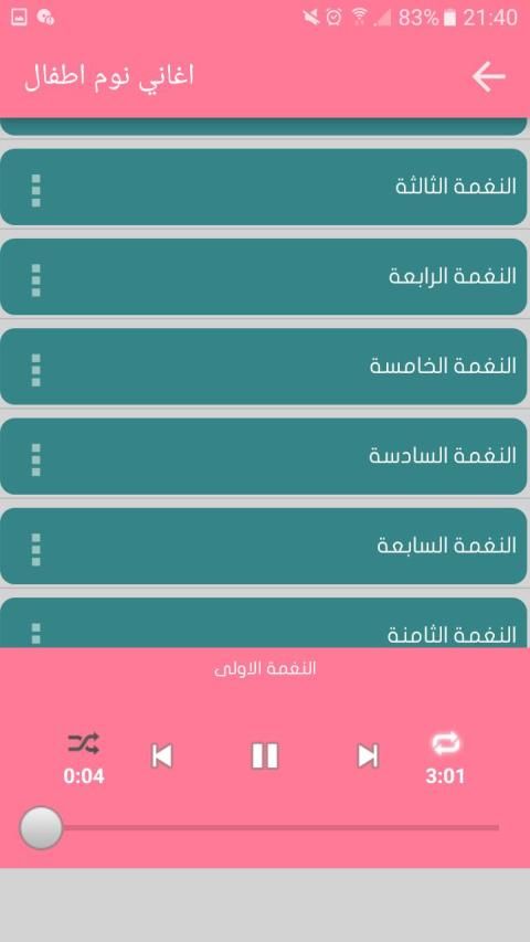 تطبيق اغاني نوم أطفال بدون انترنت يحتوي على موسيقى هادئة تساعد طفلك على النوم و يحتوي على العديد من الاغاني الصامتة الهادئة التي تساعد على الاسترخاء والتهدئة فالنوم. فلا تترددوا في تحميل هذا البرنامج المفيد للأطفال الذي يحتوي على أجمل الاناشيد ، بجودة صوت عالية ودون الحاجة إلى انترنت.