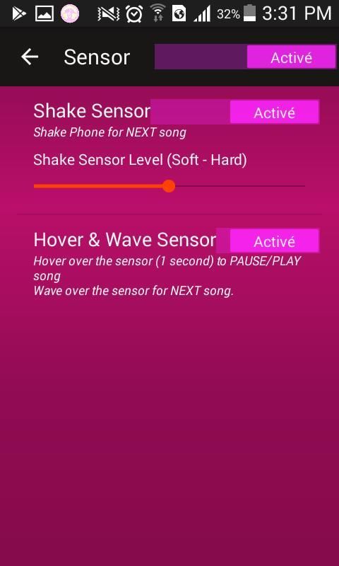 • Kontrol Sensor musik Itu Memungkinkan Anda untuk mengubah lagu tanpa menyentuh ponsel Anda. Sensor bekerja pada layar kunci. Gunakan sensor untuk jeda, bermain, dan memainkan lagu berikutnya. Kocok telepon untuk lagu berikutnya.
