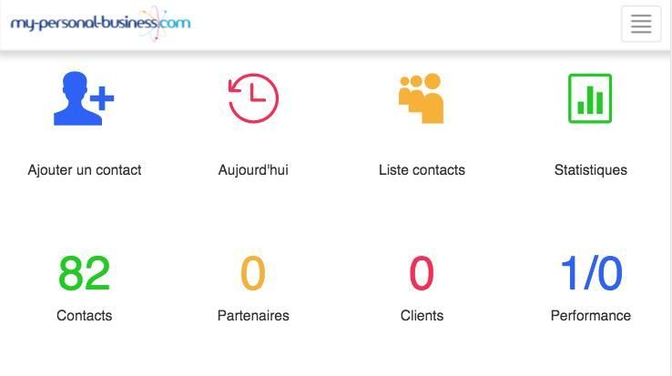 my-personal-business.com adalah setara dengan "Salesforce" (No 1 di seluruh dunia CRM) tetapi "untuk nenek saya." Sederhana, intuitif, ergonomis, multlilingue, dapat diakses di semua media, itu memungkinkan kontak pemantauan profesional dan memberikan indikator kinerja yang relevan. Hal ini terlepas dari bisnis MLM / Penjualan Langsung. Anda masuk dengan mudah, mudah keluar.