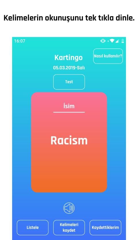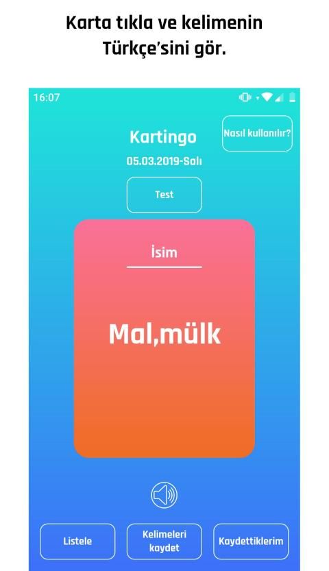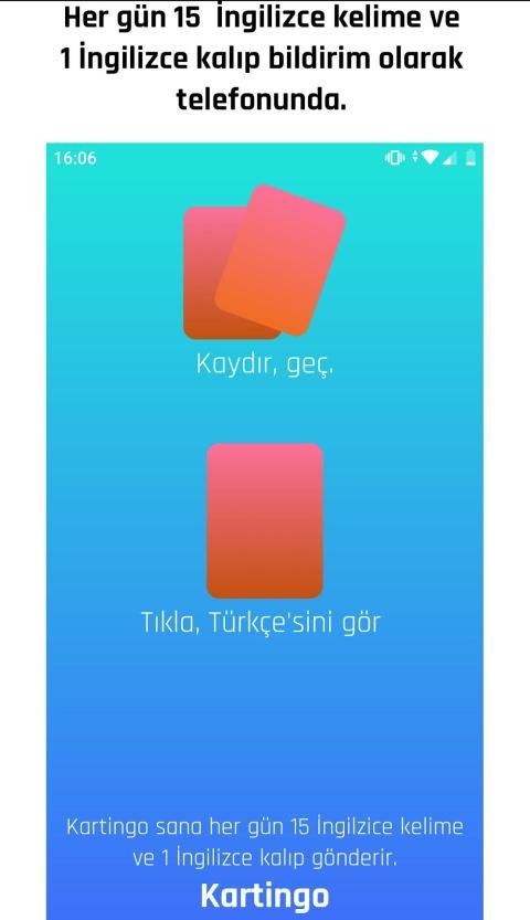 Uygulama içerisindeki kartları kaydırarak sonraki kelimeye geçebilir, kartın üzerine tıklayarak kelimenin Türkçe karşılığını görebilirsin.