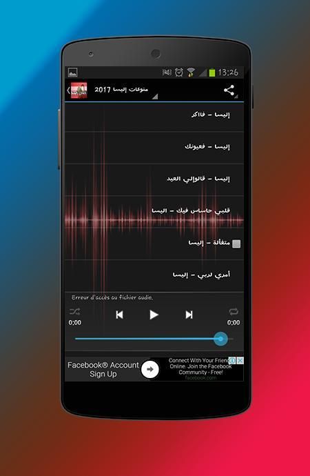'' Musik Elissa: New 2017 '' Pilihan App menampilkan lagu-lagu dari penyanyi Lebanon Arab Elissa terkenal dan dicintai, yang adalah teknis dimulai pada tahun 1992 ketika ia berpartisipasi dalam Seni Program Studio, album berikutnya, lagu yang terdapat dalam aplikasi ini.: