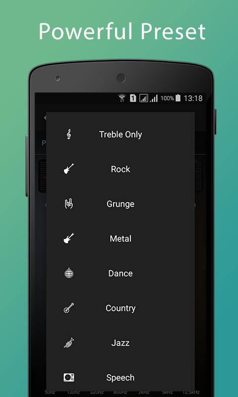 Equalizer unik membuat suara musik Anda lebih profesional. Anda bebas untuk mengontrol gaya musik sekarang.