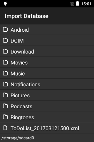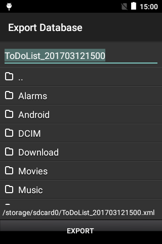 Data daftar todo dapat diekspor ke sebuah Perangkat penyimpanan eksternal seperti kartu SD. Tekan 'menu' di aplikasi tentang layar untuk mengakses fungsi impor / ekspor.