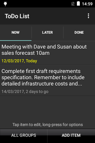 dari tampilan daftar utama Pilih grup dari daftar pop-up grup - Item yang bukan milik grup yang dipilih akan disembunyikan, kecuali mereka milik 'semua kelompok'. Grup khusus ini memungkinkan item untuk tetap terlihat terlepas dari pengaturan grup saat ini. Ini berguna untuk barang-barang yang sangat penting yang tidak ingin Anda lupakan saat menggunakan grup. Untuk mengatur grup item, edit item dan tekan tombol menu - Pilih 'set grup' dan pilih dari daftar.