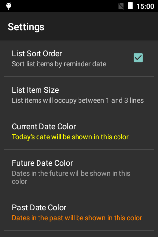 Selain deskripsi item juga dapat memiliki tanggal pengingat. Ini bisa berupa tanggal yang ingin Anda kaitkan dengan item seperti tenggat waktu, tanggal mulai atau tanggal apa pun di mana Anda ingin diingatkan tentang tugas tertentu. Untuk menetapkan tanggal, edit item dan tekan tombol Menu. Pilih 'Setel Tanggal' dan pilih tanggal yang diperlukan. Akses menu kapan saja untuk mengubah tanggal atau menghapusnya jika tidak lagi diperlukan. Ketika diatur, tanggal pengingat muncul dalam format kode warna untuk menunjukkan seberapa dekat tanggal. Tanggal masa depan, sekarang dan masa lalu dapat ditampilkan dalam berbagai warna yang memungkinkan tanggal yang sudah dekat atau terlambat terlihat sekilas. Warna-warna ini, dan fitur-fitur lain dapat disesuaikan dalam 'Pengaturan', dapat diakses dari menu utama.