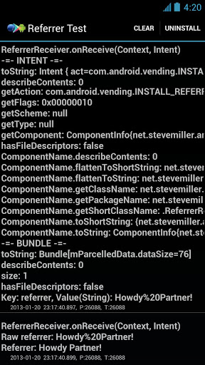 Note: To properly use this application, you should only install it if you were directed here by a URL. More details below. Referrer Test is an android test application that shows how you can pass a 'referrer' string from a website/email/ad/whatever to the google Play store on Android, have the user install your application, and then have the Play store pass the referrer string into your Android application after the install completes. This application, it's source code, and the accompanying website allow you to test how referrer strings work.To get started, go here to build a URL that will direct you back to this Play store page from a URL with a referrer parameter.http://SteveMiller.net/ReferrerTest/You can find the source to this project at...https://github.com/SteveMil/AndroidReferrerTestFor a quick test, click the link below. It will direct you back to this page, but include "Howdy Partner!" as the referrer string. After installing the application, you will see "Howdy Partner!" in the log window within the app.https://play.google.com/store/apps/details?id=net.stevemiller.android.referrertest&referrer=Howdy%20Partner!