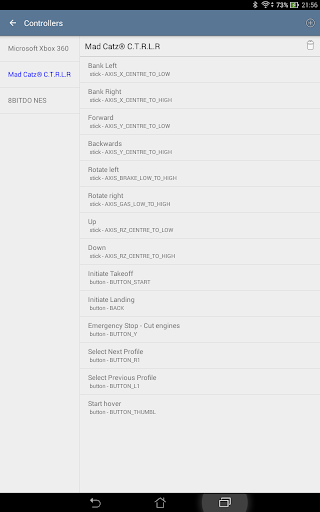 Intuitive flying of your A.R. Drone (no support for Bebop yet) with a standard USB or Bluetooth controller like the Playstation, Xbox, or Mad Catz Controller. Handle your drone with analog sticks and precise movements.