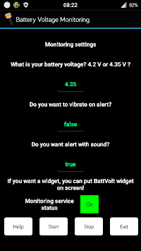 have a 4.35V battery. This application monitors two kind of batteries: 4.2V and 4.35V. Default setting is for 4.2V. To modify the settings you need to write 4.2 or 4.35, respectively, false or true. For the health of battery, the monitorisation process alerts you before of full charging and full discharging of battery because overcharging and overdischarging deteriorates the battery. Also charging below the maximum gives health to battery. The monitorisation service starts when you open this application for the first time and also starts at boot. If you want a widget that shows battery voltage, you must go to homescreen and add the BatVolt widget, but the monitorisation service works with or without the widget. The monitorisation service start at boot but if you want for some reason to disable temporary (until reboot or until restart this application) the monitorisation service, you can make it. You must know that the widget you can put optional on the screen is based on the service. So, temporarily disabling the service affects widget functionality. Also you can start again the service. If you like this application, please gives a rate on play store. If, for some reason, a notification appears in notification bar, after a phone reboot, for example, and won't disappear, you need to run the application, eventually stop and restart the service and exit.