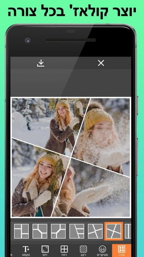 עורך תמונות ויוצר קולאז' עוצמתי עם המון אפשרויות כמו אפקטים, סטיקרים, מסננים שונים וכל מה שצריך כדי לעשות את התמונה המושלמת או ליצור את הקולאז' המושלם.
