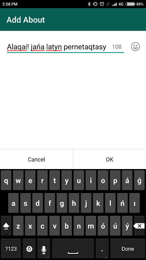 Latin keyboard for newly accepted latin alphabet for kazakh language. Now symbols like "á ń ǵ ý ú ó" can be typed easily. Dashed letters called Acute are found on the right side of board.