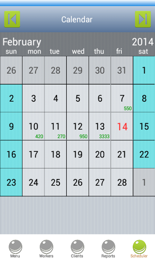 ★ Bagian penjadwal memungkinkan penyimpanan semua janji dan timing pekerjaan yang dapat digunakan untuk Lihat janji temu saat ini dan mendatang serta menunjuk waktu untuk pekerjaan baru sesuai dengan ketersediaan. Bagian laporan memungkinkan laba per hari, per pekerja dan jumlah total yang diperoleh untuk dilihat dan dihitung hampir secara instan. Kalender muncul di layar yang mencantumkan jumlah yang diperoleh per hari di bawah setiap tanggal yang memungkinkan pengguna untuk memeriksa janji temu pada tanggal dan pendapatan pekerjaan bersama dengan rincian pekerjaan.