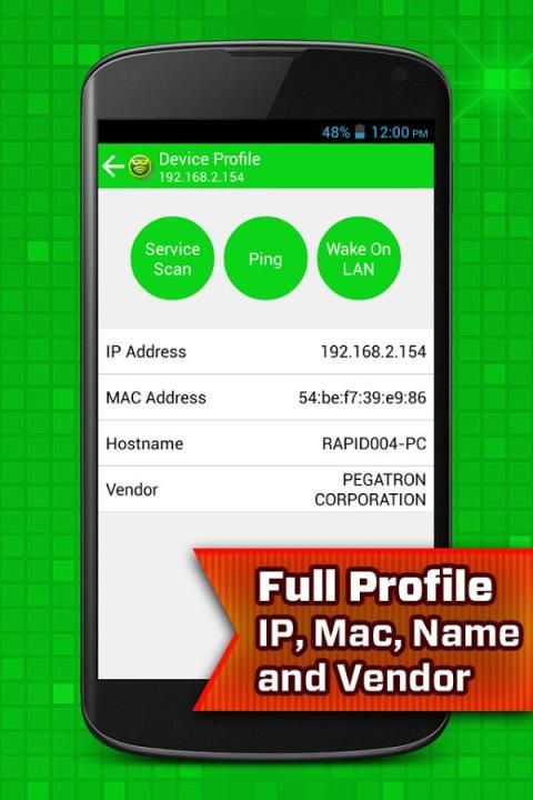 • Display full profile such as device name, manufacturer, IP address and Mac address