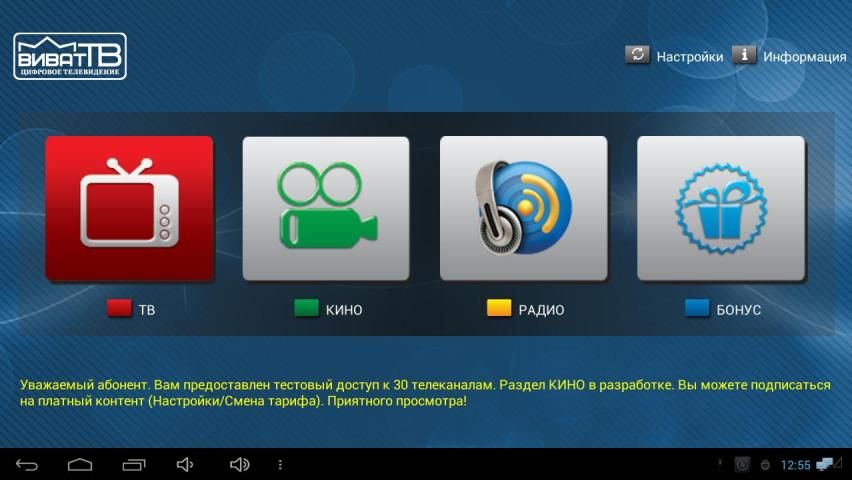 Saat pertama kali masuk Anda akan mendapatkan akses gratis ke 30 saluran (6 saluran dalam arsip hingga 7 hari), 240 stasiun radio internet dan kemampuan untuk melihat WEB-kamera 30 HD.