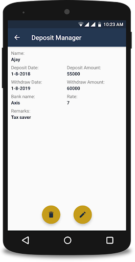 This Application helps you in Listing your Bank's Deposits for your reference. With this Application you can list your all the Deposits from different banks.