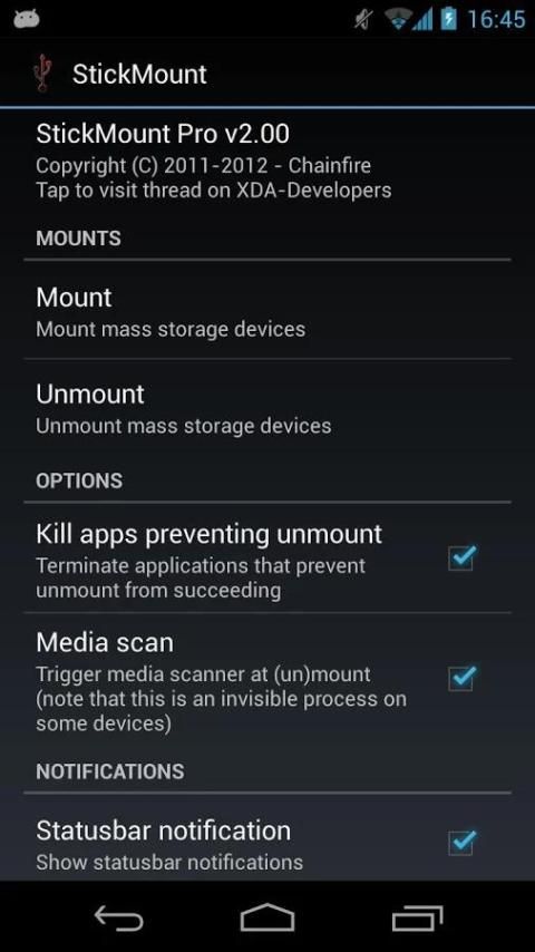 Secara otomatis mount dan turun stik USB pada berbagai perangkat seperti Galaxy Nexus, Nexus 7 dan Nexus 10 The Nexus 4 tidak didukung -. Ini merupakan masalah dengan perangkat, tidak dengan StickMount!