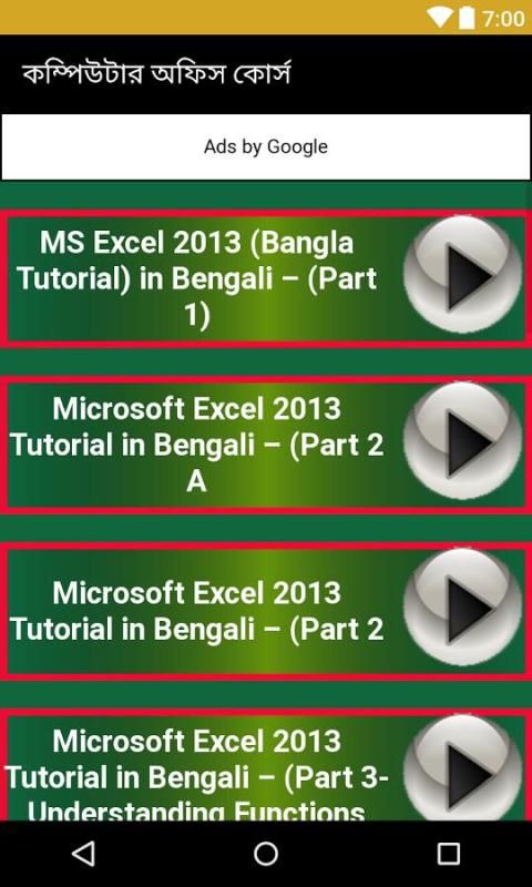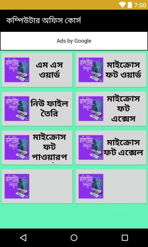 কম্পিউটার অফিস কোর্স কম্পিউটার শিক্ষা অ্যাপটি একটি কম্পিউটার ট্রেনিং অ্যাপ. কম্পিউটার শিক্ষা একটি অপরিহার্য বিষয়. যুগের সাথে তাল মিলিয়ে চলার জন্যে সবারই কম্পিউটার শেখা উচিত. তাছাড়া বর্তমানে অনেকেই ফ্রিল্যান্সিং ও আউটসোর্সিং এর মাধ্যমে অনলাইনে আয় করছেন ফলে ব্যাঙের ছাতার মত গজিয়ে উঠেছে প্রচুর কম্পিউটার কোচিং যারা বিভিন্ন রকমের কম্পিউটার টিপস, কম্পিউটার সার্ভিসিং এমনকি ফটোশপ, কম্পিউটার টাইপিং ও কম্পিউটার প্রোগ্রামিং বই পর্যন্ত শিখিয়ে থাকে. তাছাড়া মাইক্রোসফট এক্সেল, মাইক্রোসফট ওয়ার্ড, মাইক্রোসফট অফিস এগুলোও শেখান হয়. আমরা এই অ্যাপ টিতে অনেক জিনিসই যুক্ত করেছি. উল্লেখযোগ্য ফিচার গুলো হচ্ছেঃ-