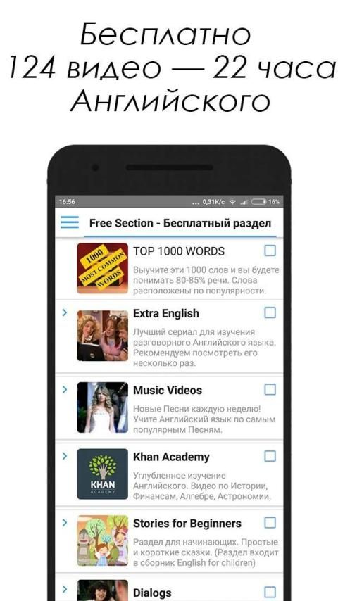 Выучить иностранный язык очень легко с нашим приложением. Оно подойдет как для тех, кто хорошо знает английский язык (у нас есть khan academy, фильмы, сериалы, диалоги), так и для детей, начинающих.