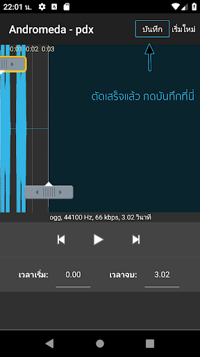 - แตะที่ใดก็ได้ในคลื่นเสียง เครื่องเล่นเพลงจะเริ่มเล่นที่ตำแหน่งนั้น
