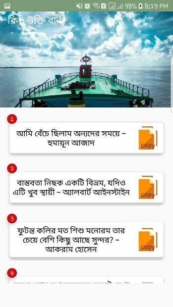 "বাংলা মেসেজ" adalah aplikasi Pesan Teks pendek Bangla lain yang menakjubkan. Melalui aplikasi ini Anda dapat berbagi atau mengirim SMS Teks Bangla dengan teman dan keluarga Anda. Memiliki sepenuhnya Bengali & Banglish SmS. Ini akan membantu Anda untuk mengirim sms ke kekasih Anda di Bangla & Inggris. Dari aplikasi ini Anda akan menemukan pesan luar biasa untuk menggambar kurva senyum pada kekasih Anda. Anda juga dapat membagikannya dengan teman-teman Anda melalui Facebook dan jejaring sosial lainnya.