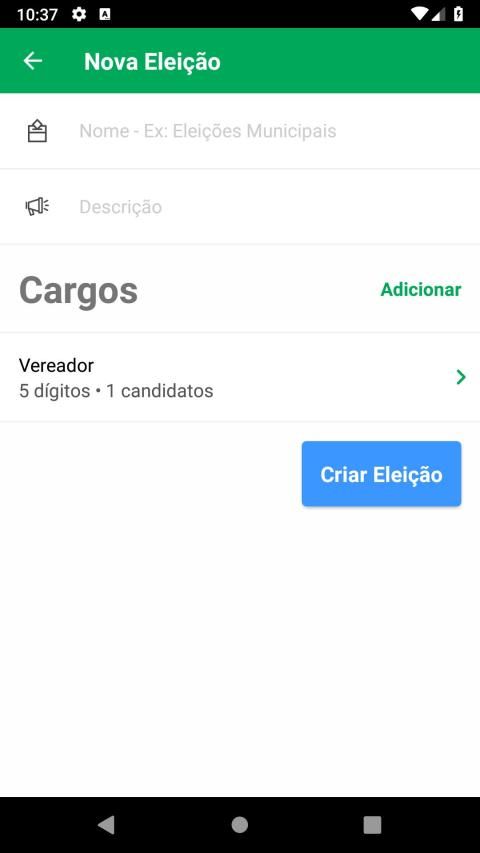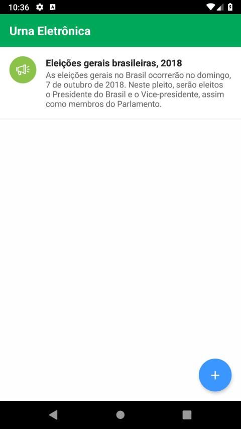 O aplicativo vem com uma eleição cadastrada por padrão, e apresenta para cada cargo, uma lista de candidatos fictícios.