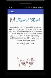 Mental Math app is useful for fast calculation and everyday life, banking exam, ssc exam, upsc, IIT, GMAT, CAT, GRE, NET, exam etc. With its infinite number of questions user can improve calculation skill. When you need to crunch numbers quickly — and I mean really quickly — you need to practice more and more.