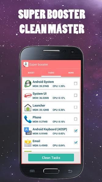 "Super penguat - cleane master" Tim akan mencoba yang terbaik untuk mengoptimalkan Android CPU, RAM, dan baterai dengan satu satu-tap