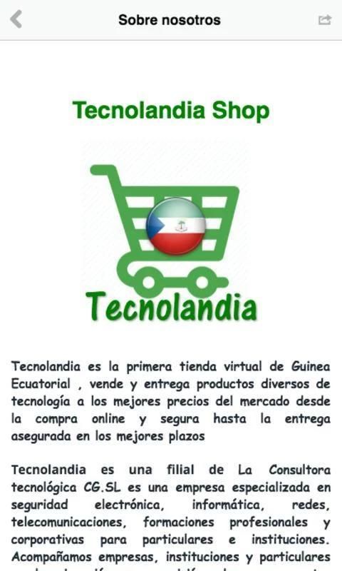 Tecnolandia adalah toko online yang mengkhususkan diri dalam produk Equatorial Guinea, layanan dan solusi teknologi. Saat ini hanya disampaikan di Malabo, G.E dilakukan tetapi akan segera diperluas ke seluruh negeri dan seluruh Spanyol.
