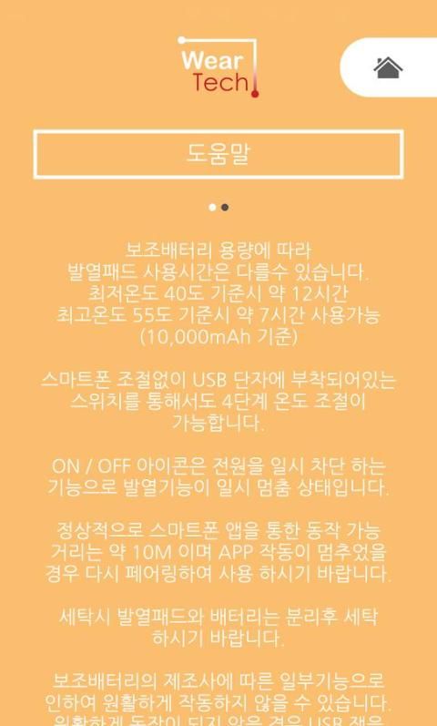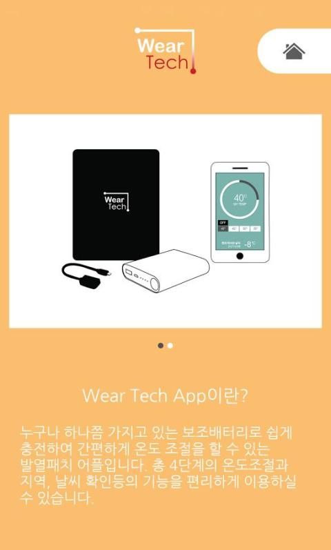Wear Tech(웨어텍) 어플리케이션은 스마트폰을 이용하여 의류에 부착된 발열패드를 단계별로 온도를 선택할수 있도록 하고, 의류내 온도를 사용자가 원하는 온도로 유지하도록 자동으로 조절하는 기능과 사용자 위치, 지역 온도정보를 제공하는 어플리케이션입니다.