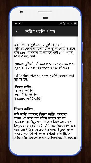 jomir porimap jomir porcha and jomir tothya . We always face some difficulties while we want to learn about jomir ayin / jomir ain . But by using this app you will learn about jomir ayin very easily . Jomir hisab is very easy if you know jomir hisab nikas . This is one of the best land measurement app bangla. In this app you will get complete idea about land law in bengali