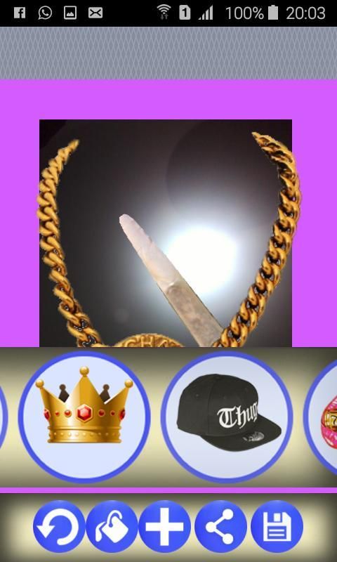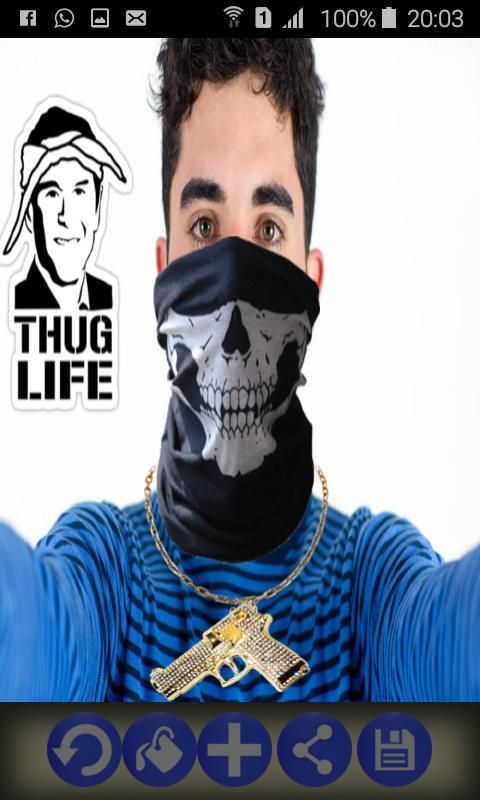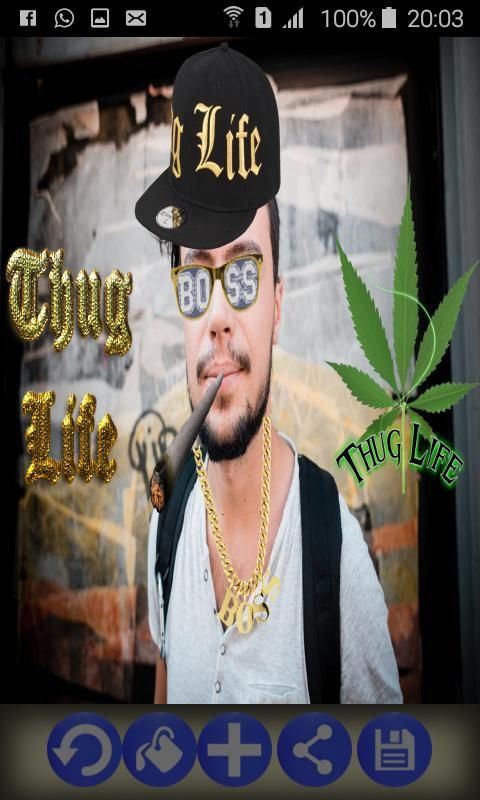 Ambil Foto atau memilih salah satu dari Galeri Anda. Tekan Plusbutton di pusat untuk menambah Gangster dan ThugLife Stuff seperti Topi, Senjata atau Sunglasses. Tarik ke tempat yang tepat dan mengubah ukuran atau memutar menggunakan multitouch. Menyimpan dan berbagi dengan teman-teman Anda.
