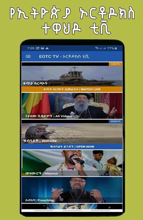 EOTC TV menyediakan akses langsung ke TV Ortodoks Ethiopia Tewahdo Church, dan lagu-lagu dan mezmur ortodoks Ethiopia.