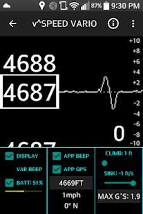 Aplikasi ini akan memberikan citra yang lebih baik dari apa v Anda ^ SPEED Vario melakukan seperti yang mentransmisikan data bluetooth hidup dari ketinggian barometric, kecepatan vertikal, dan tingkat daya baterai. Fitur lain termasuk diimplementasikan GPS untuk ketinggian GPS, kecepatan gerak, dan pos. bip Audio yang dilaksanakan adalah membantu untuk mendengarkan setiap kaki pendakian serta wastafel nada variabel. Accelerometer dilaksanakan adalah untuk melacak max G-force selama giliran keras atau spiral. Tampilan visual mencakup grafik garis kecepatan vertikal, serta nomor bergulir ketinggian sehingga Anda dapat melihat kecepatan vertikal yang tepat Anda. Pendakian dan tenggelam ambang batas yang dapat disesuaikan dalam aplikasi, yang juga mengubah ambang batas pada vario eksternal secara otomatis.