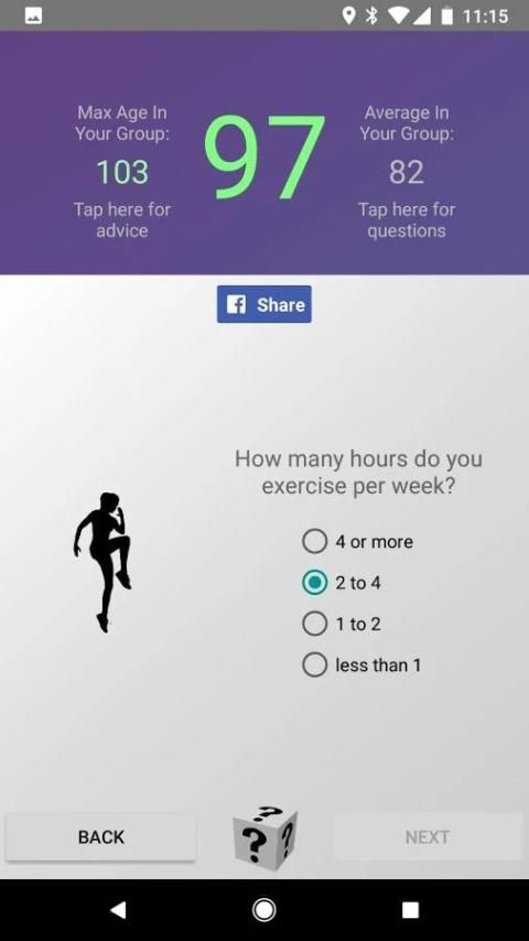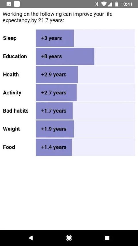 Anda akan dapat melihat berapa lama lagi Anda bisa hidup dengan membuat perubahan gaya hidup besar atau kecil. Tim kami terus bekerja pada memperkaya kolam pertanyaan yang tersedia dalam aplikasi untuk mengeksplorasi semua kemungkinan dan potensi perubahan dalam rutinitas sehari-hari yang membantu untuk meningkatkan harapan hidup Anda dan hidup lebih lama dan hidup sehat.