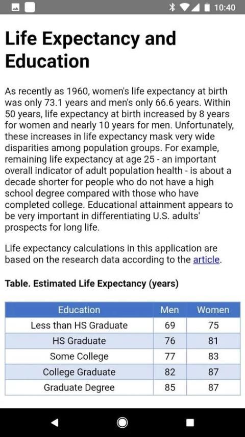 Unduh aplikasi dan belajar tentang faktor-faktor yang mempengaruhi rentang hidup Anda. Meningkatkan harapan hidup Anda dengan mengikuti saran yang kita miliki untuk Anda.