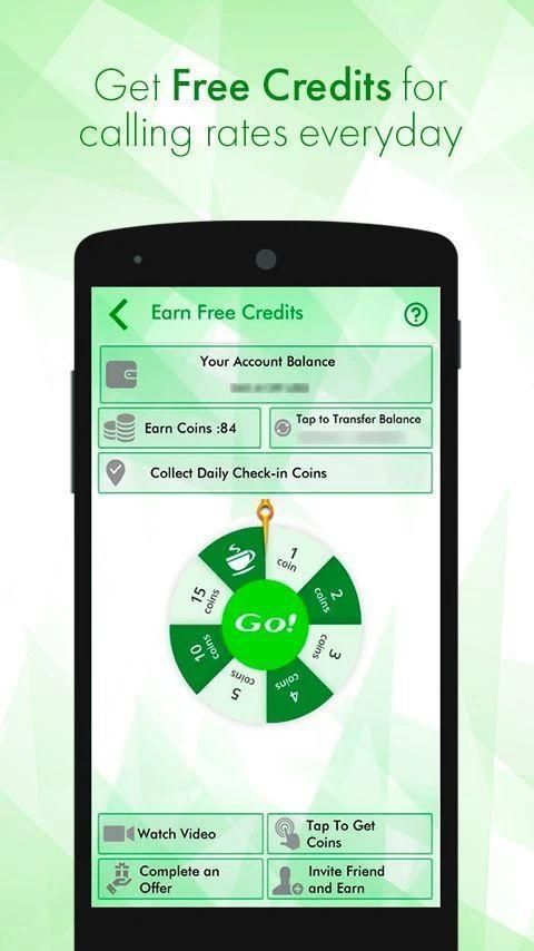 Ada banyak cara untuk mendapatkan Kredit GRATIS tanpa batas di aplikasi kami untuk tarif panggilan. Dengan memainkan roda keberuntungan, permainan, memeriksa setiap hari, berbagi pos, mengundang teman, menonton iklan, menyelesaikan tugas, dll ... Yang kita inginkan hanya perlu satu ketukan untuk menyelesaikan tugas lucu aplikasi kita sambil menikmati panggilan GRATIS terbaik layanan.