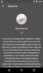 Do you own a business either Traditional or Online? Are you looking for sales or leads for your services and products, but are struggling to get the word out, then look no further Work2Money is here to help. We are your first choice when it comes to advertising your products or service online. Working with us guarantees you an increase in sales and profits. Work2Money delivers real targeted audience worldwide while at the same time giving you an opportunity to begin earning by simply participating in our traffic exchange and revenue share services. Sign up and start benefiting from Quality traffic and hourly income.
