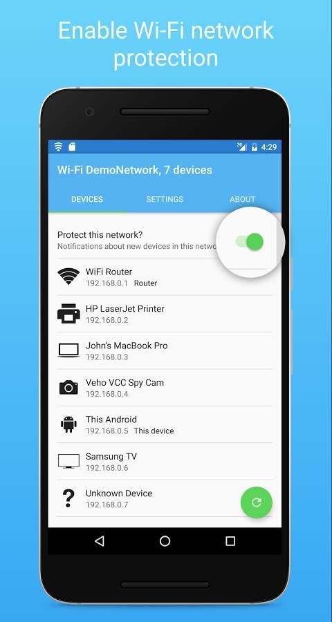 Wi-Fi laggy? Mungkin tetangga Anda telah diretas sandi Anda dan diam-diam menggunakannya. Dengan Penjaga WiFi aplikasi Anda akan dapat mencegah akses tidak sah ke jaringan Anda. Aplikasi ini memindai Wi-Fi Anda dan mendeteksi semua perangkat yang terhubung.
