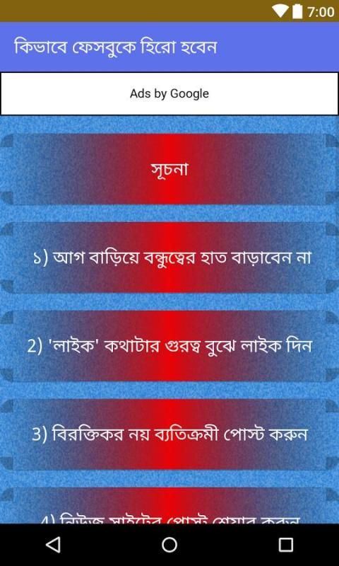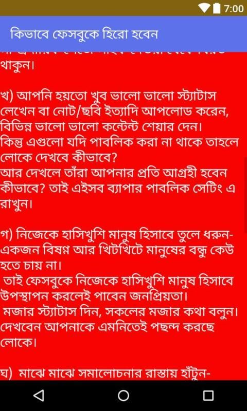 ফেসবুকে হিরো হওয়ার টিপস বাংলা নিয়ে আমরা আমাদের এই ফেসবুক হিরো অ্যাপটি বানিয়েছি যাতে করে আপনি একজন আদর্শ ফেসবুক ইউজার হিসাবে নিজেকে তুলে ধরতে পারেন. এই ফেসবুক হ্যাক এ রয়েছে বাংলা ফেসবুক স্ট্যাটাস সব কি করে দিতে হবে তা থেকে শুরু করে কিভাবে আপনার অ্যাকাউন্ট সিকিউর করতে পারবেন তার দারুন দারুন সব টিপস অ্যান্ড ট্রিকস.